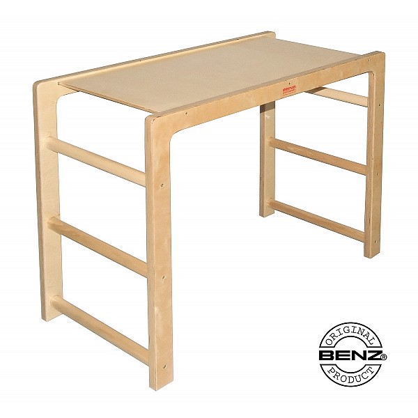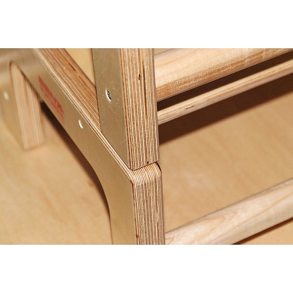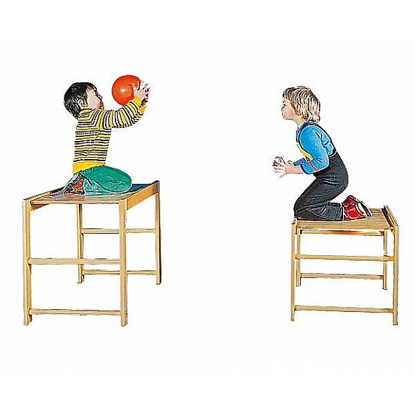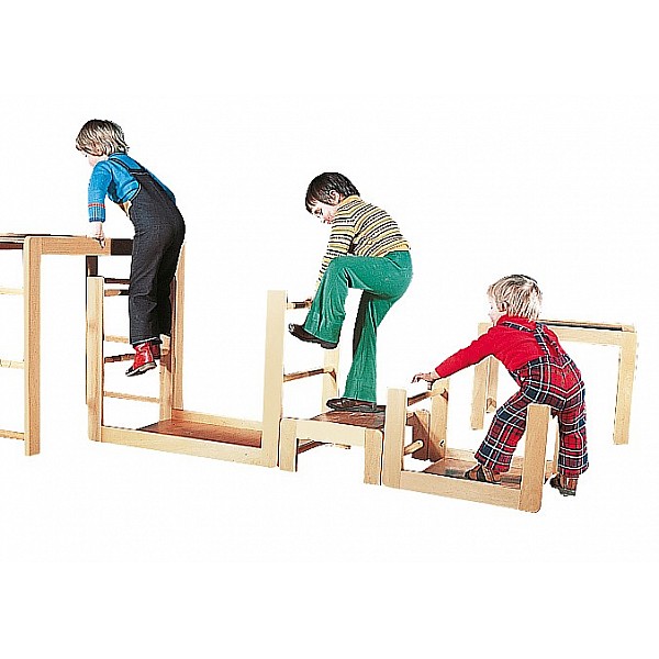 Sehr stabile, hochwertige Holzausführung, natur lackiert, bestehend aus 9 Holztreppen mit eingeleimter Deck-Trittplatte. Die sich dadurch ergebende geschlossene Fläche ermöglicht ein Spielen und Turnen ohne Unfallgefahr. Abmessungen größtes Element (B x H x T) 99 cm x 80 cm x 50 cm.