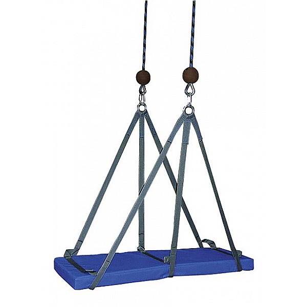 Leichtschaummatte mit Gurtbändern und Stahlringen. Ermöglicht liegendes, stehendes und sitzendes Schaukeln allein oder zu zweit. Größe 33 x 100 cm. Befestigung wie Abb. für Multischaukel. DBGM beantragt.